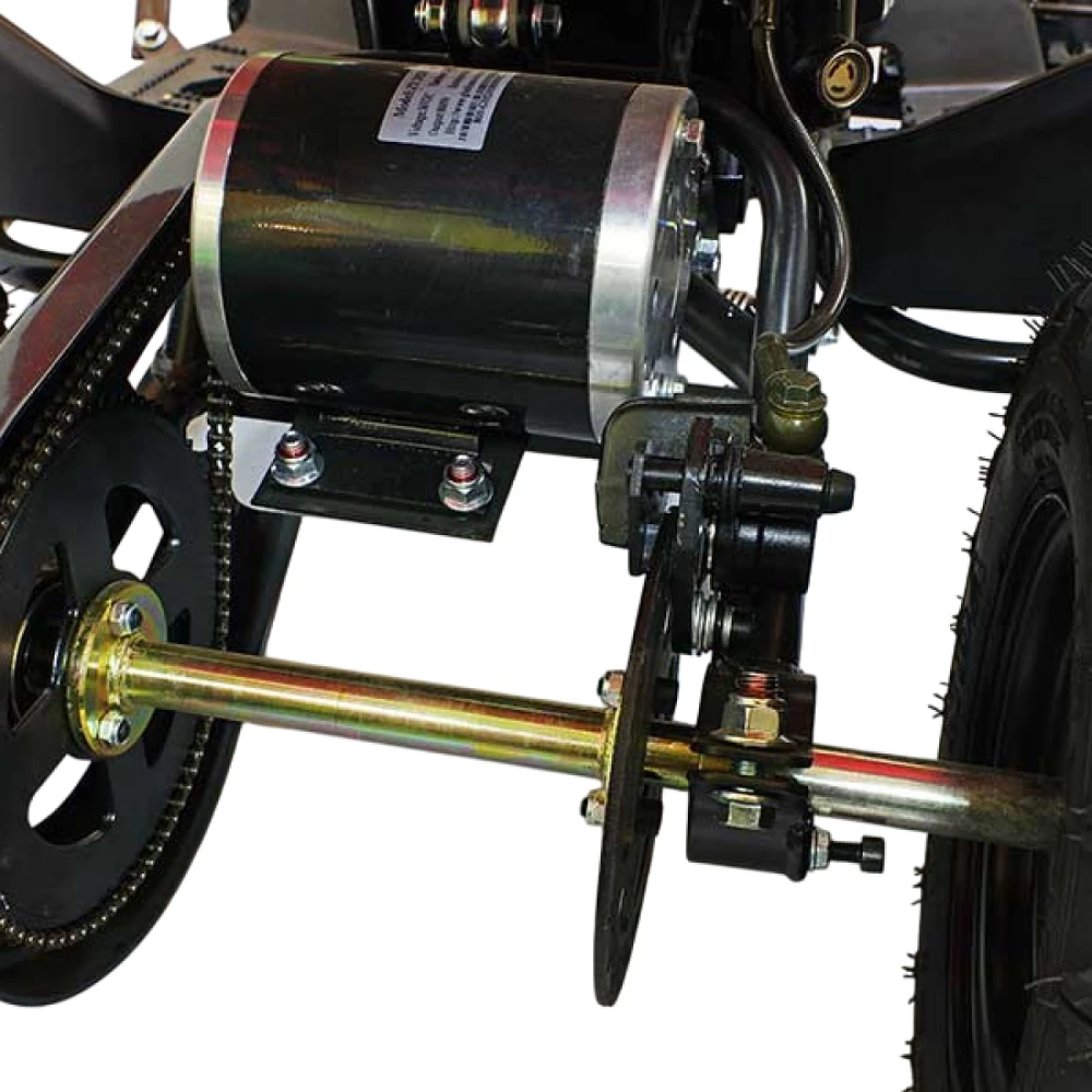 В традиционной конструкции подвески с четырьмя пружинными амортизаторами, заменен передний тормоз на гидравлический ножной, а задний остался дисковым механическим на рулевом рычаге.