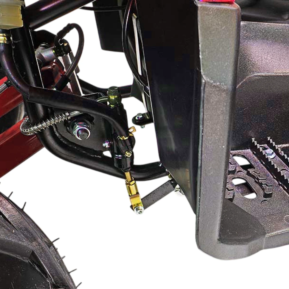 У GreenCamel Caxapa A1520 два вида батарей, можно приобрести квадроцикл с штатной батарей 20 Аh SLA GEL, у которой запас хода 40 км. Ресурс 20 тыс. Км, время зарядки 8 часов. В комплектации есть более мощная батарея 42 Аh Boston, запас хода 80 км. Ресурс батареи 100 тыс. Км, время заряда 16 ч. У квадроцикла отсутствует спидометр, и шнур безопасности на руле.