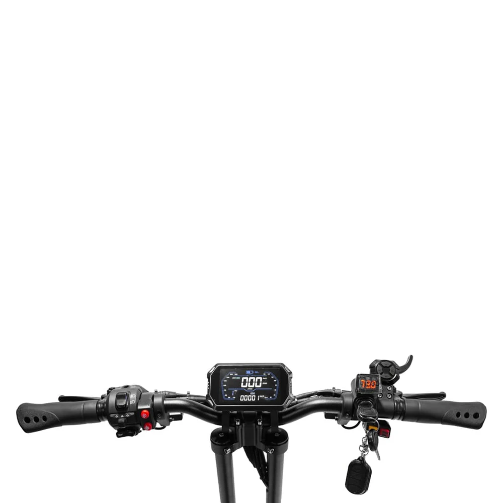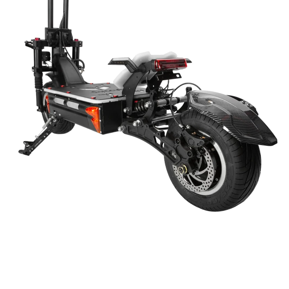 Два мотора по 5500 Вт пик (номинал 1100 Вт) обеспечивают разгон до 110 км/ч за 4 секунды и подъем на 35° под 200 кг, 14" пневмоколеса с протектором гасят вибрации на грунте; литий-ионный аккумулятор на призматиках 72V 50Ah дает реальный пробег 70-90 км в eco-режиме, 50-70 км в turbo при 80 кг. Гидравлические дисковые тормоза на переднем и заднем колесах останавливают за 4-5 м даже на мокром, режимы Eco/Turbo балансируют производительность (Eco — 50 км/ч, 100+ км; Turbo — 110 км/ч, 50 км), энергоэффективность повышается за счет рекуперации и мощных контроллеров. Зарядка занимает 7-8 часов без быстрой опции, пробег падает на 30-40% в холод или под нагрузкой.​