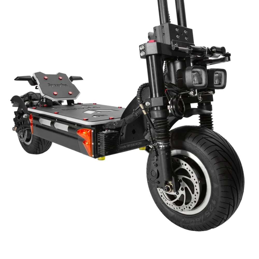 Электросамокат Syccyba T1000 — полноприводный внедорожник с пиковой мощностью 11000 Вт, скоростью до 110 км/ч, пробегом до 100 км и нагрузкой до 200 кг, предназначенный для экстремальной езды по городу и бездорожью.​